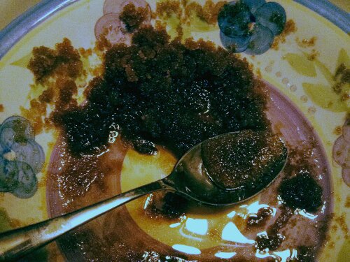 Stir until it looks a little moist but still grainy. Keep the remainder in a closed container to prevent drying out or as I say, crustiness.