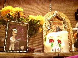 After feasting, we sneaked through the Day of the Dead exhibit. There is a diverse array of art mediums, including full shrines, wood burnings, statues and prints. No pics are allowed in the exhibit but here is Skeleton Elvis leering outside. He’s a hunk o burning bones.