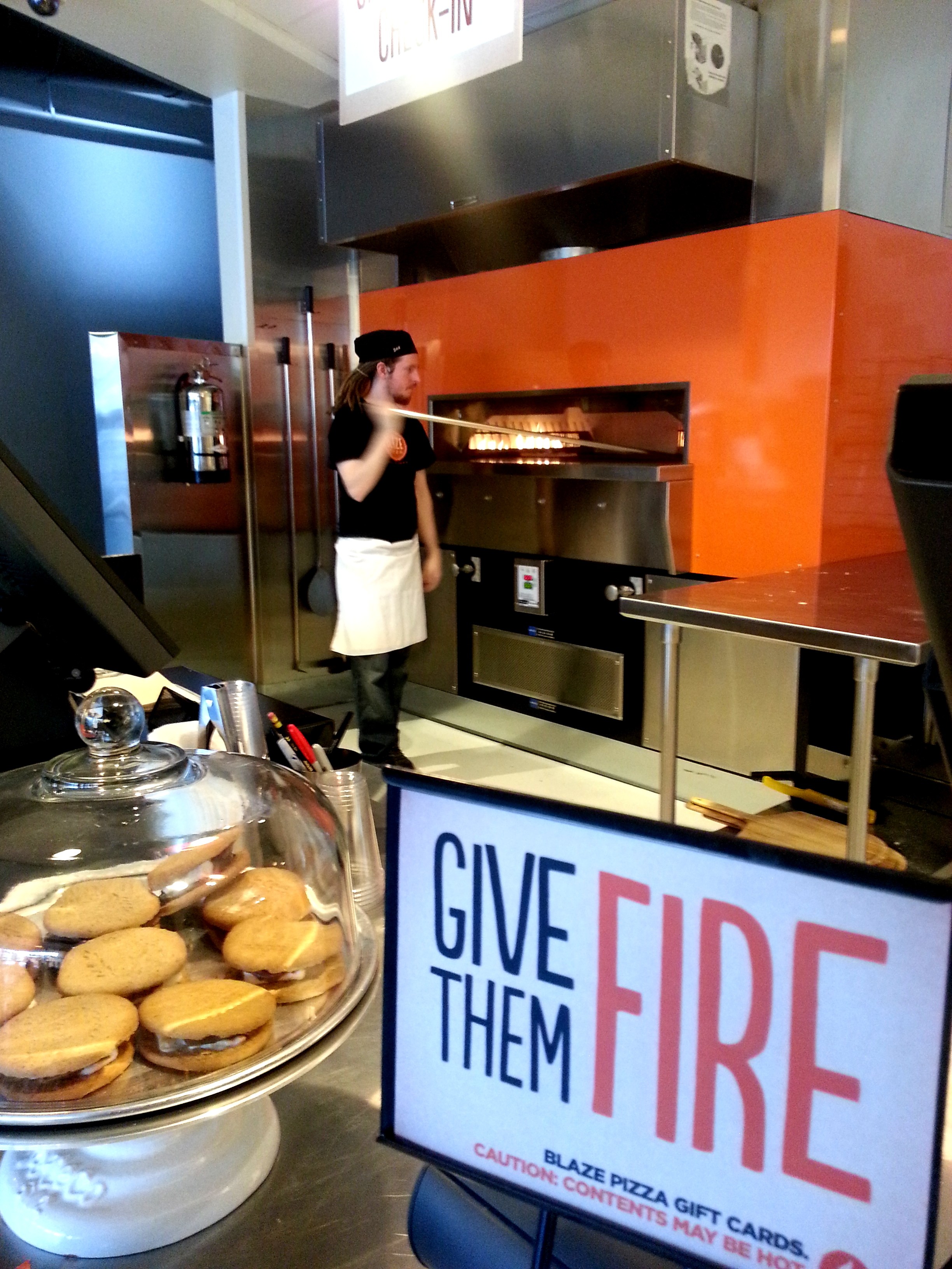 As we shyly peeked around, they detailed the Blaze pizza process for us. The fine art of pizza creation is set up in an assembly line format. Patrons can pick their own pie toppings and sauce or choose a signature ‘za and watch while it is made. Pizzas are 11 inches of thin crust glory and take only 3 minutes to cook. We were intrigued by the gigantic oven and learned that 12 pizza could fit inside which brings to mind sitcom hijinx of craaazy pizza cooking. The oven man assured me that he avoided that magnitude of pizza multitasking. The oven does, however, cook pizzas at a blazing (get it?!!!?) hot 800 degrees.
