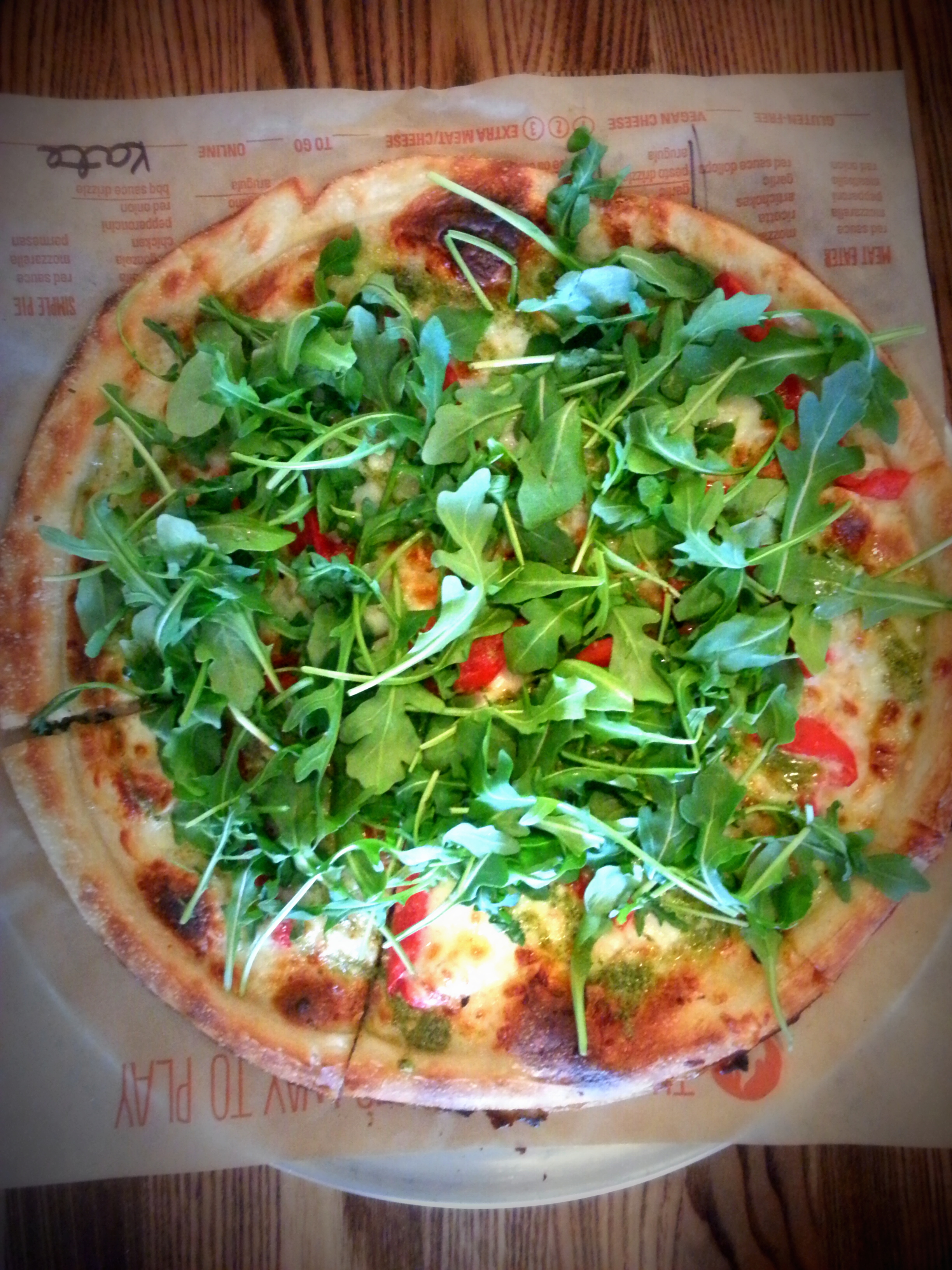 There were a ton of signature veggie pizza options available to us as well as gluten free and vegan substitutions. We decided on the Red Vine, with fresh mozzarella, cherry tomatoes, basil and chunky red sauce, and the Green Stripe, with pesto sauce, arugula, and garlic minus the chicken.