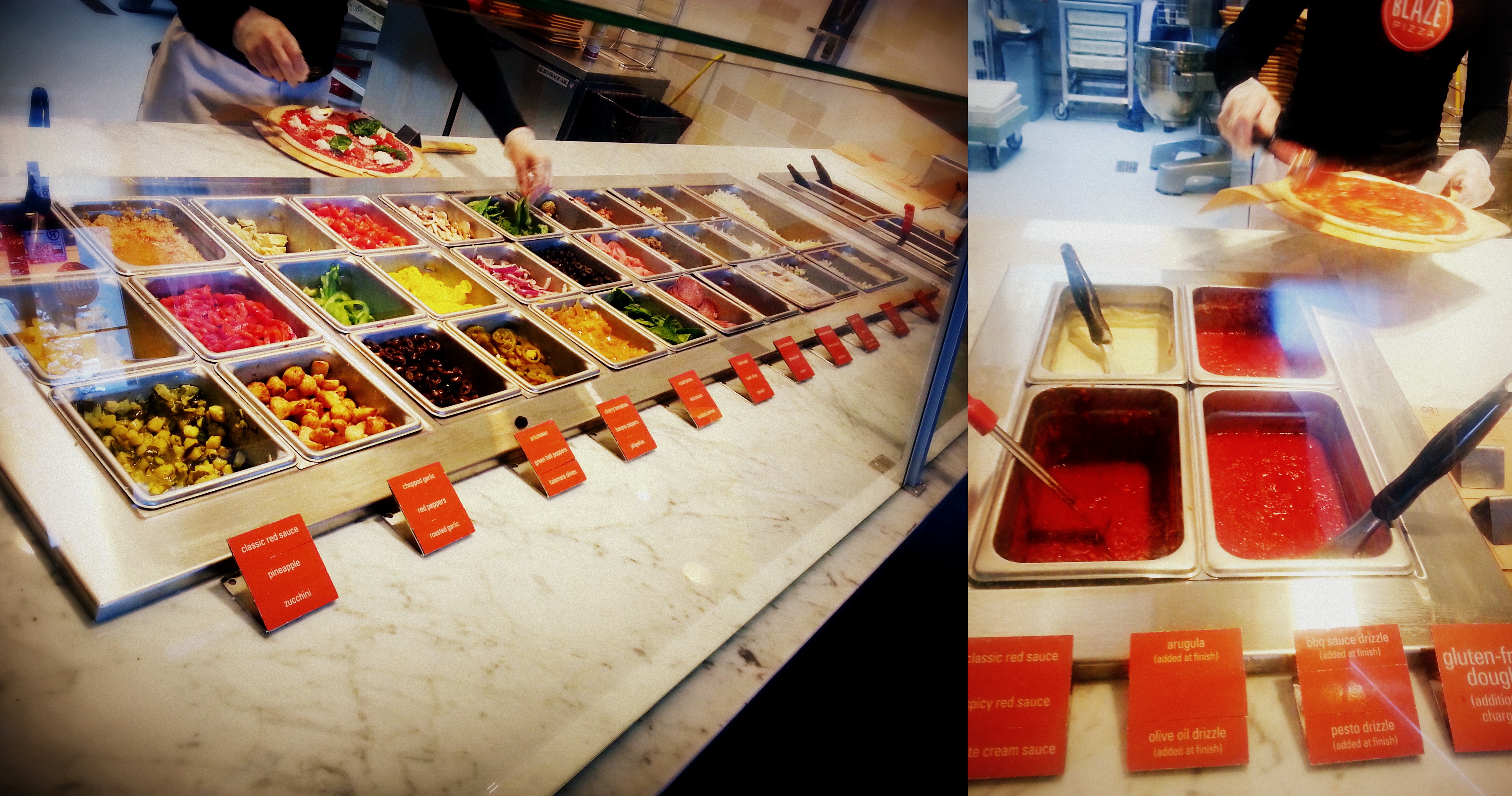 Oh Twitter, how we love thee. Recently, the Chicago Food Scene held a Twitter poetry competition for free Blaze pizzas. We dug deep back to our middle school Haiku writing days and typed a clever pizza ditty….and won!! Once our coupons came, we gleefully braved the snow to try the “new to Chicago” casual pizza chain, Blaze Pizza, situated in Boystown right near the El stop. We weren’t really sure what to expect when we entered but the staff hollered out a welcome and invited us to come closer.