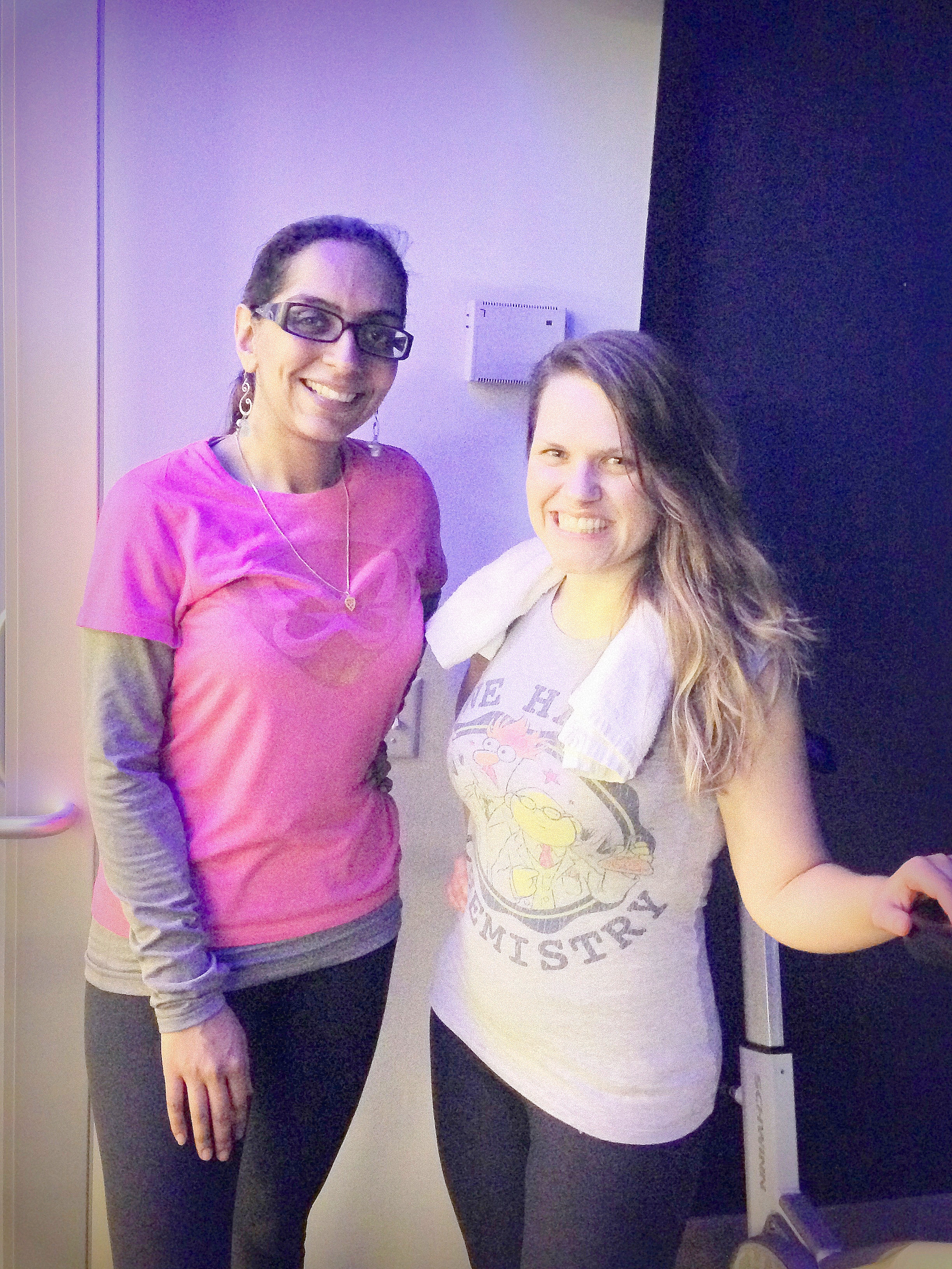 Mid February, right around V-day, we spent a little time giving love to ourselves by trying a new workout. Kate has always been a little hesitant about indoor cycling, a.k.a spinning, while Monica was fascinated with this high-energy fitness style. We picked the perfect opportunity to jump in and test the spin cycle when Cheeky Chicago planned a Valentine’s studio cycling event with Equinox Lincoln Park. We made it to class just in time to get on our bikes and chose the back row to avoid the front row spotlight.