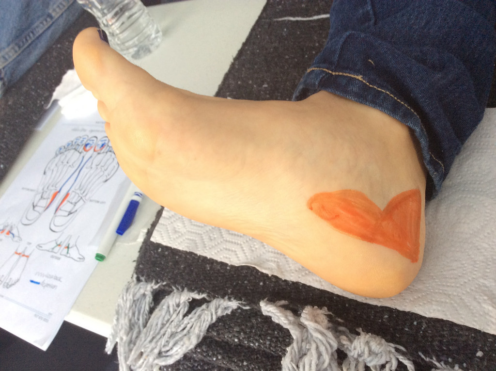 Sarah led us through which parts of the foot connected to parts of the body. As we followed along, we shaded washable marker diagrams on each other’s tootsies to signify different systems: digestion, reproduction, heart, and more.