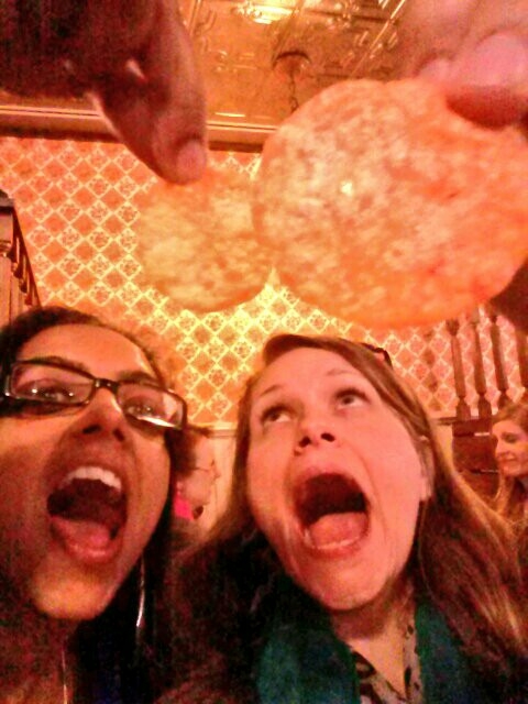 Once we checked in, we walked upstairs to the VIP lounge.  Each table had several snack bags of BBQ Popchips awaiting our arrival.  Potbelly staff walked around with samples of the several types of sandwiches on the new flatbread.  We both tried a full sized veggie Mediterranean and Kate nibbled the tiny sized grilled chicken and cheese.  The Wreck, Turkey and Tuna on the flats were also available but we didn’t partake.  After we gobbled down our sammiches, we delighted in a “Drop the Popchip in your mouth” competition.