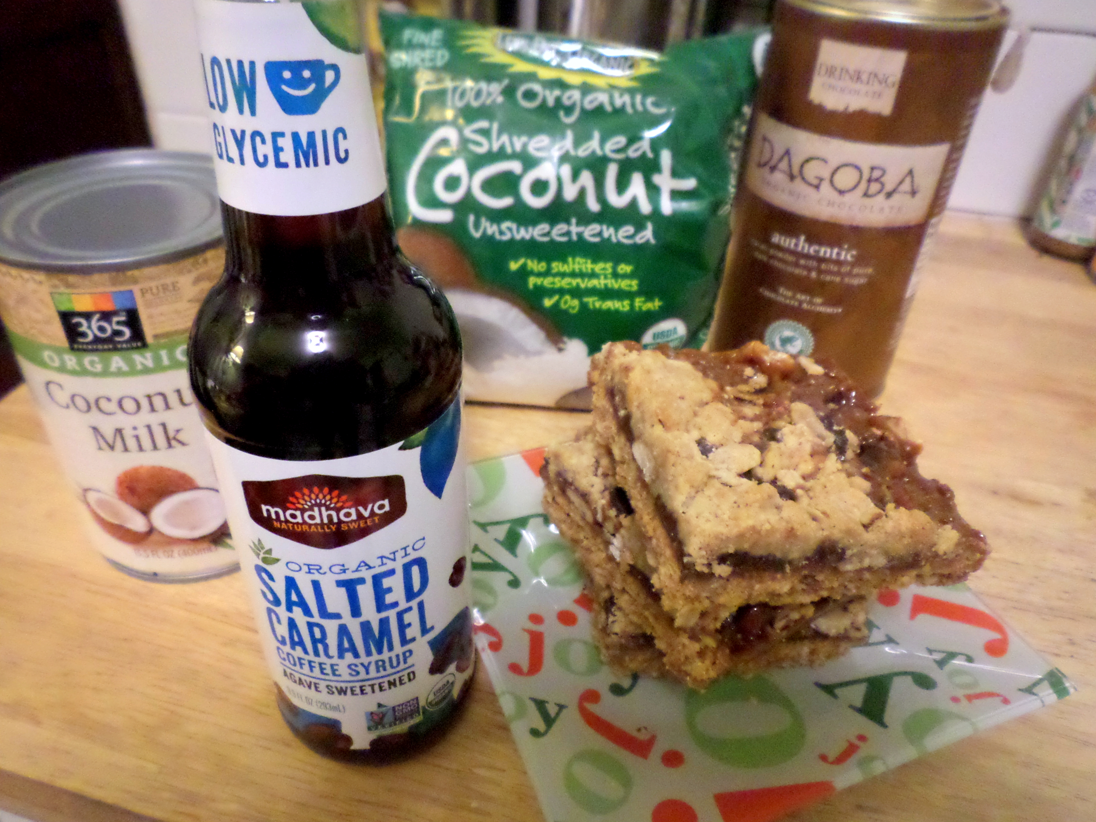 So what sweet fancy treat did we decide to create? Well our product of choice was Madhava Salted Caramel Agave Coffee Syrup. Not sure if you realize this but Chicago is bbbrrrrr cold so hot drinks are all the rage! Recently, we have been treating ourselves to some highfalutin drinking chocolate at one of our favorite local sweets purveyors. Needless to say, why pay $7 for it (and not know what’s in it) when we can make it ourselves (and for others to impress at our next holiday party)? We decided to twist up the normal Salted Caramel trend and were inspired by an old 60’s throwback dessert, the Dream Bar, AKA the “Caramelita” in other circles. These addictive high calorie desserts normally include a devious combination of caramel, oats, chocolate chips, butter (tons of butter), and evaporated milk or heavy cream. Madhava helped us lighten it up and still make a tempting yet less devilish dessert.