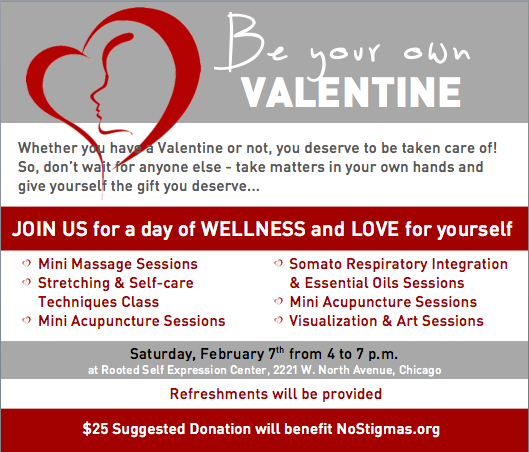 Oh and treat yourself sometimes! Rooted Center is hosting “Be Your Own Valentine” on February 7th from 4-7 pm to give you a chance to Love Yo’ Self with mini spa treatments, expressive art sessions and more. The $25 dollar suggested donation goes to NoStigmas.org. NoStigmas is a global non-profit movement utilizing Peer-2-Peer connections to promote mental wellness and prevent suicide. Their individual approach provides education, support systems and access to mental health resources at no cost.