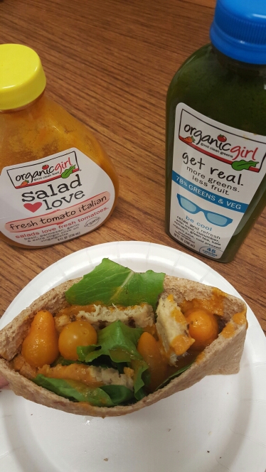 The Zesty Tomato Italian mingles with pepper greens, feta, artichokes, olives and roasted garlic. For a fast and easy lunch, take a Toufyan multigrain pocket filled with greens, organic yellow cherry tomatoes, Morningstar Farms grilled chicken and dressing.
