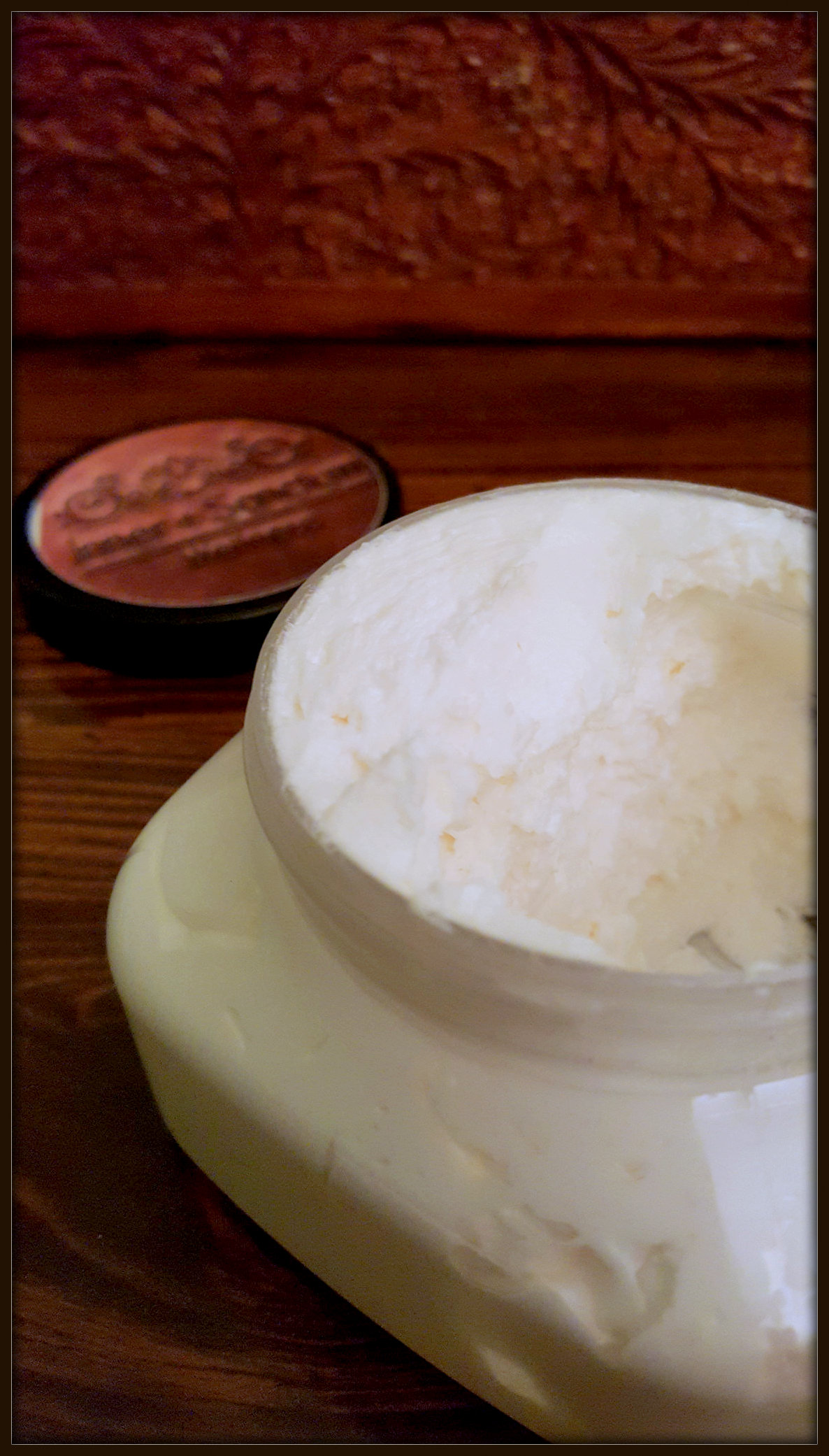 Vitamin E for healthy skin, almond and avocado oils, with mango butter, swirled with essential oils.