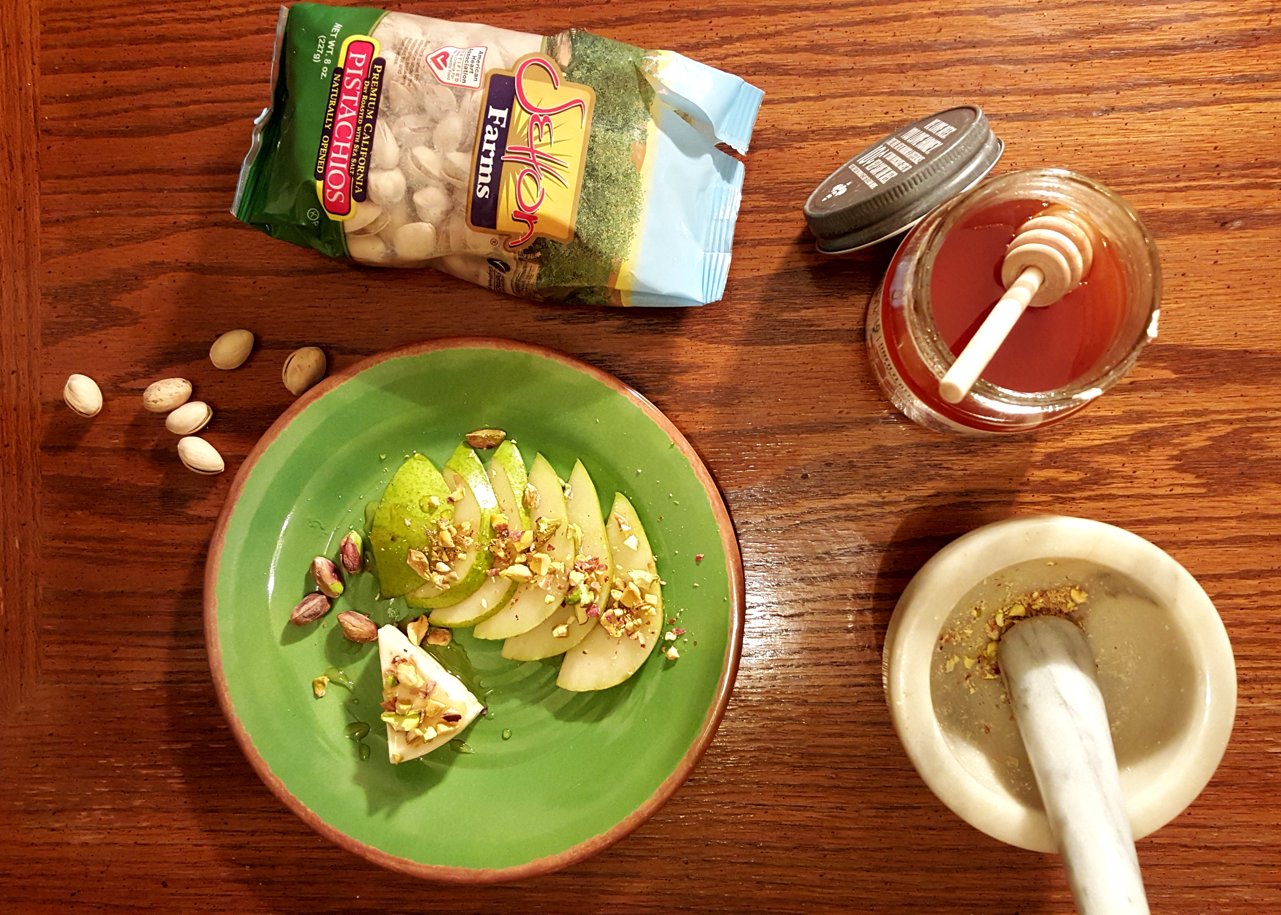 Slice the pears and lay them on plate. Spread asiago cheese on or nearby the pears. Drizzle honey over the pears and cheese. Crush the pistachios and sprinkle them on top. Eat and Enjoy!