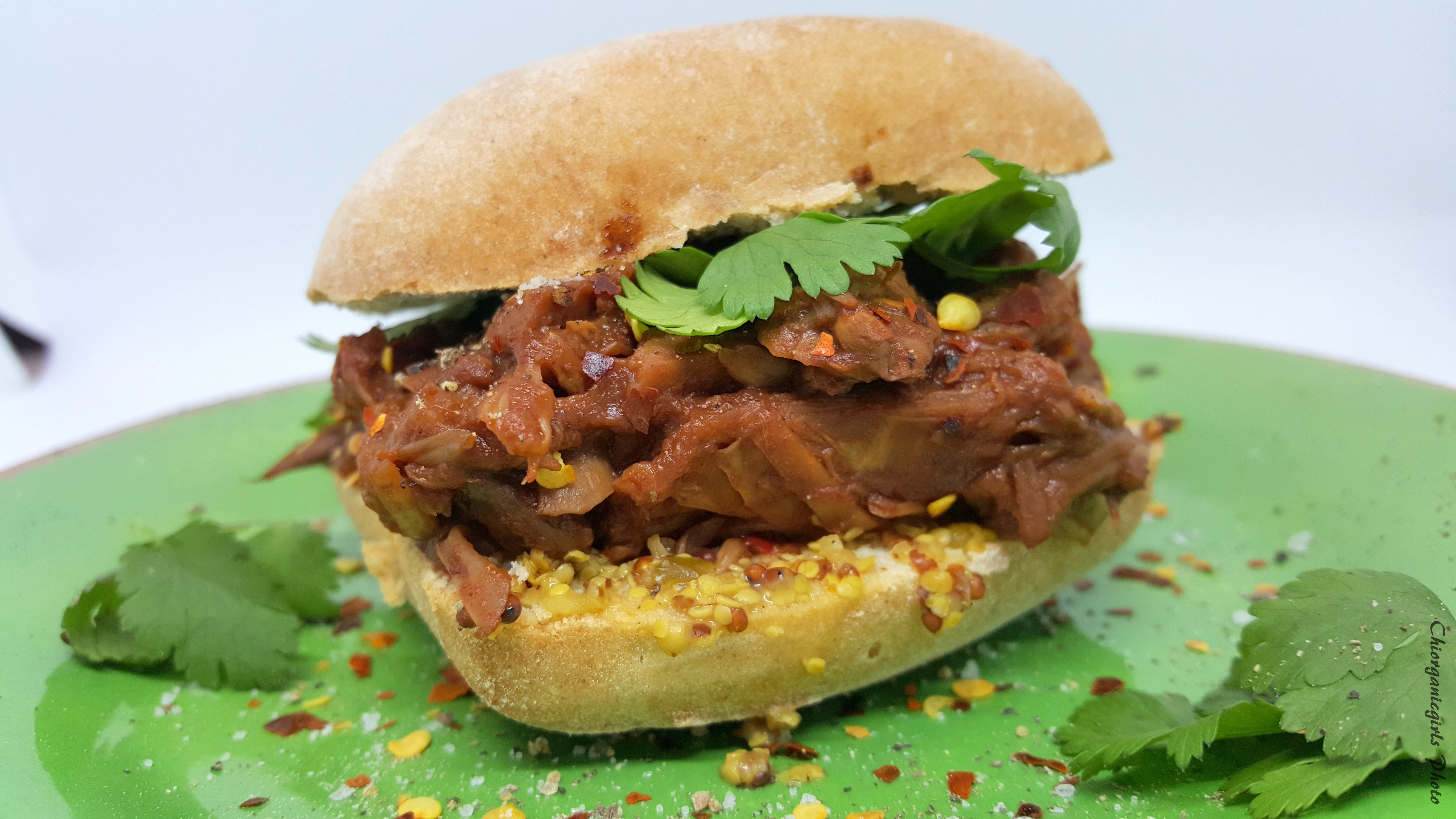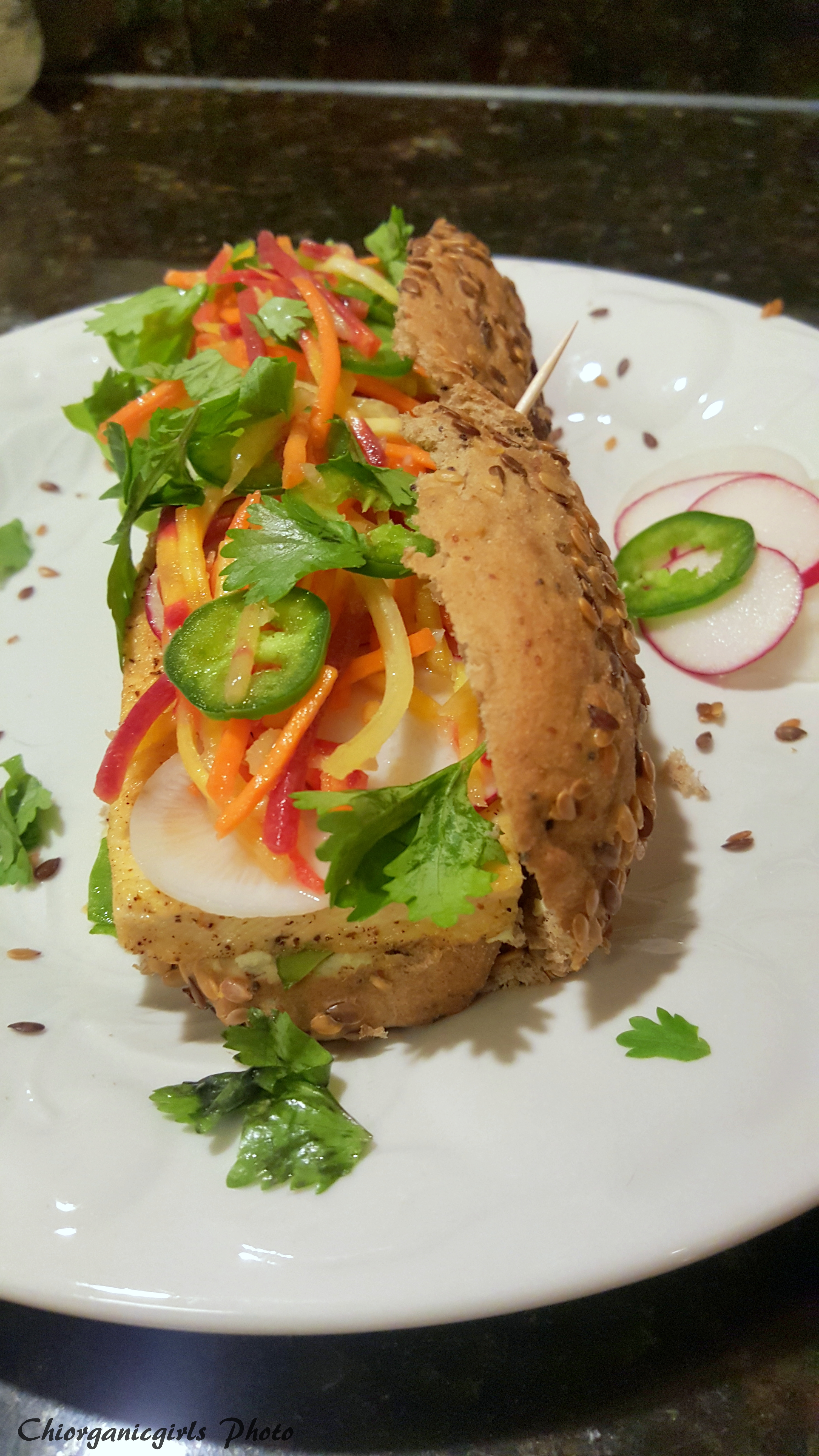 Vegan banh mi sandwich with Nasoya marinated teriyaki tofu, organic carrot slaw, white and red radishes, lemon vinegrette, jalapeno, cilantro and BFree Brown Seeded Bun.