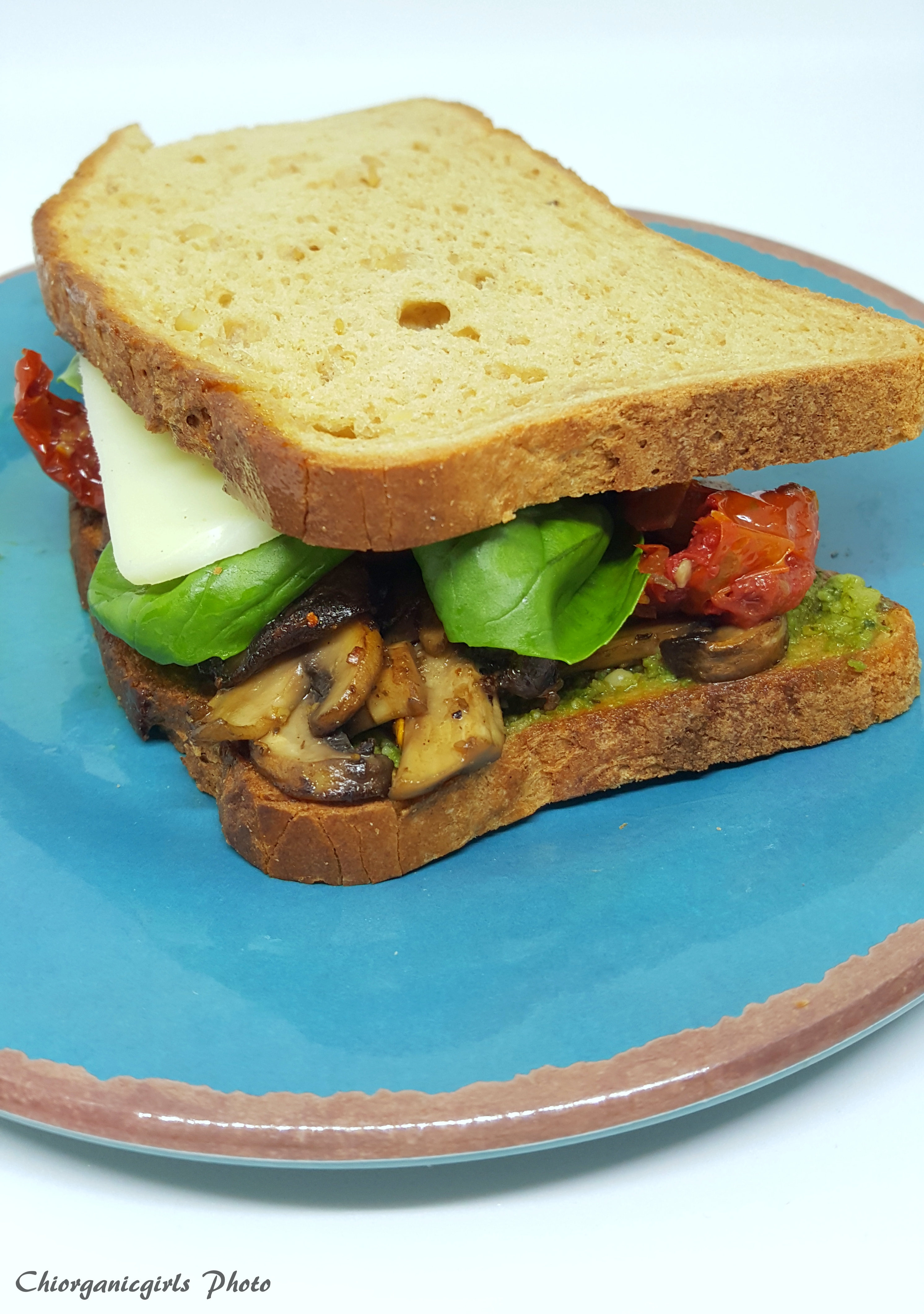 BFree Brown Seeded Loaf with pesto, sauteed mushrooms, basil, spinach, sundried tomatoes and Lucrene mozzarella cheese.