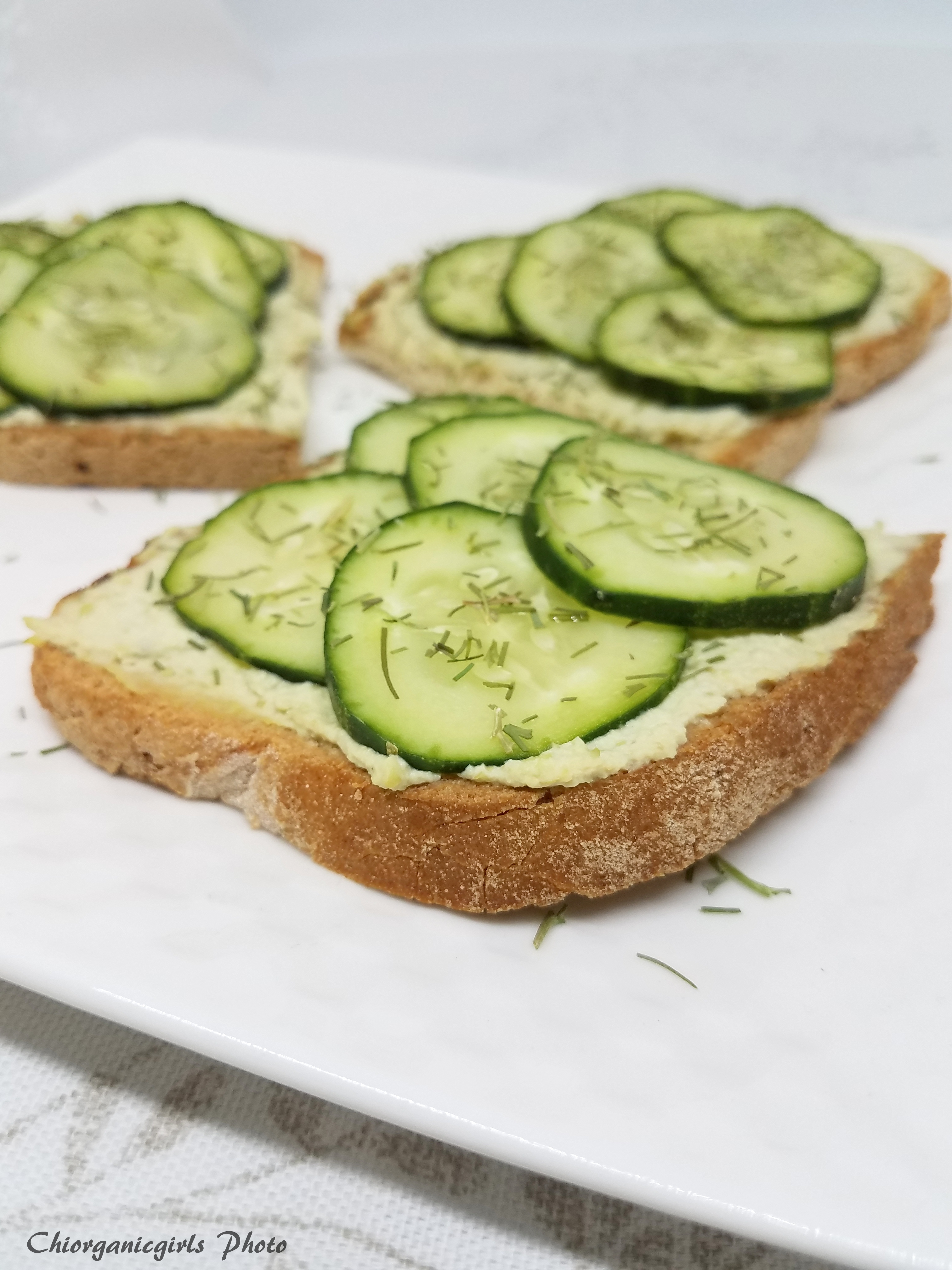 Tea Time with BFree Foods white loaf spread with Latana (formerly Eat Well Embrace Life) Edamame “Hummus,” cucumbers and dill.