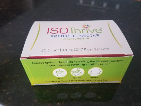 ISOThrive has no calories and is a prebiotic soluble fiber, also know as a a prebiotic nectar (sweet!). Each serving, or convenient individual packet contains 1g of maltosyl-iso-malto-oligosaccharides (MIMO). ISOThrive is the same ingredient that occurs when food is fermented.